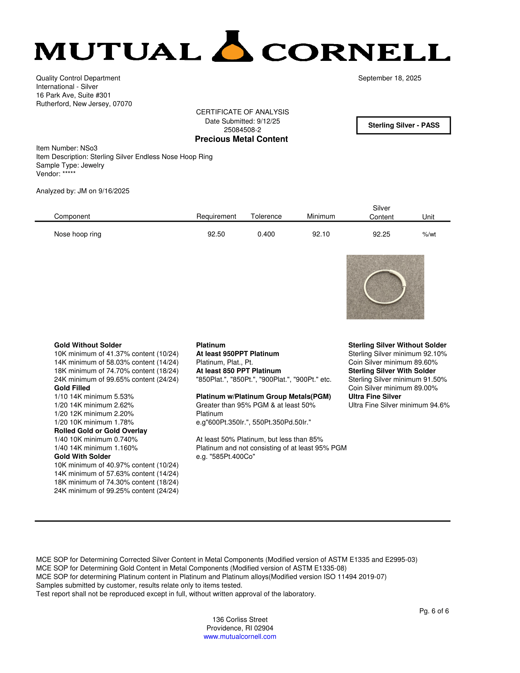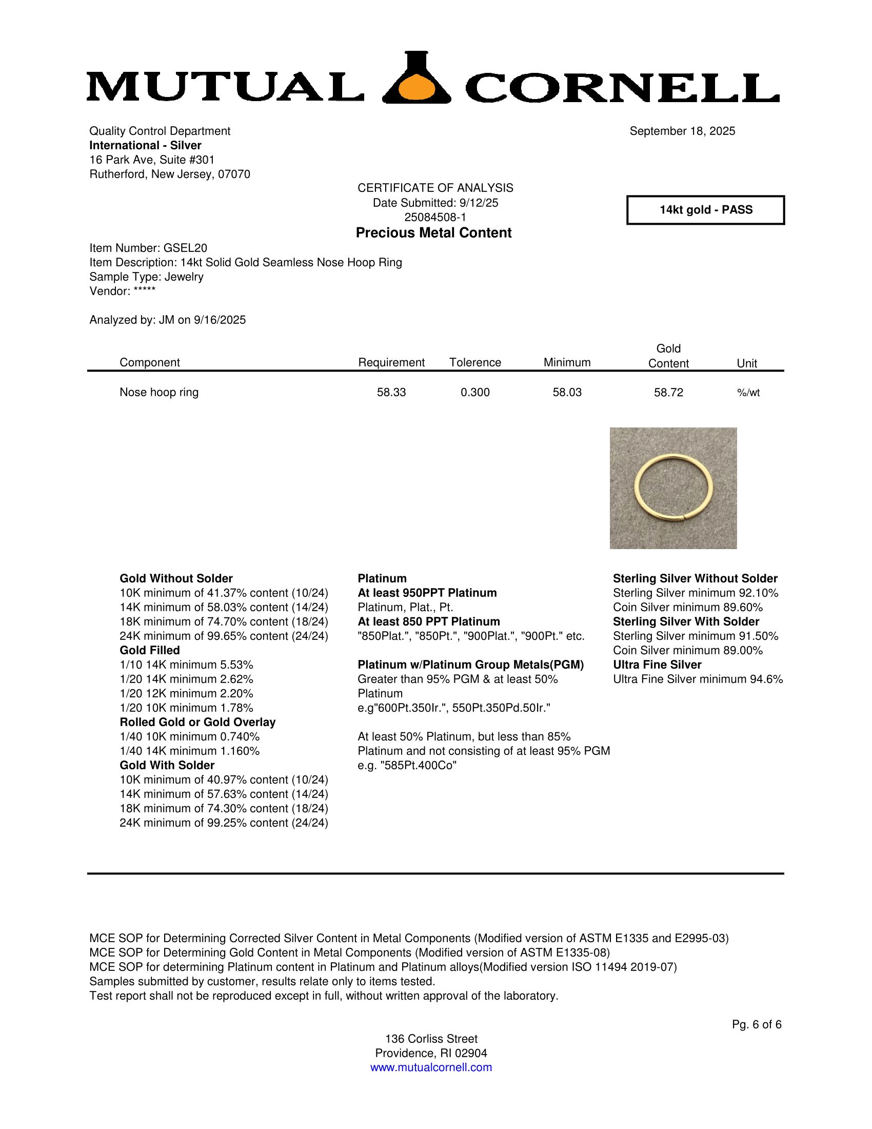 Certification of 14Kt Gold and Sterling Silver of International-Silver Body Jewelry