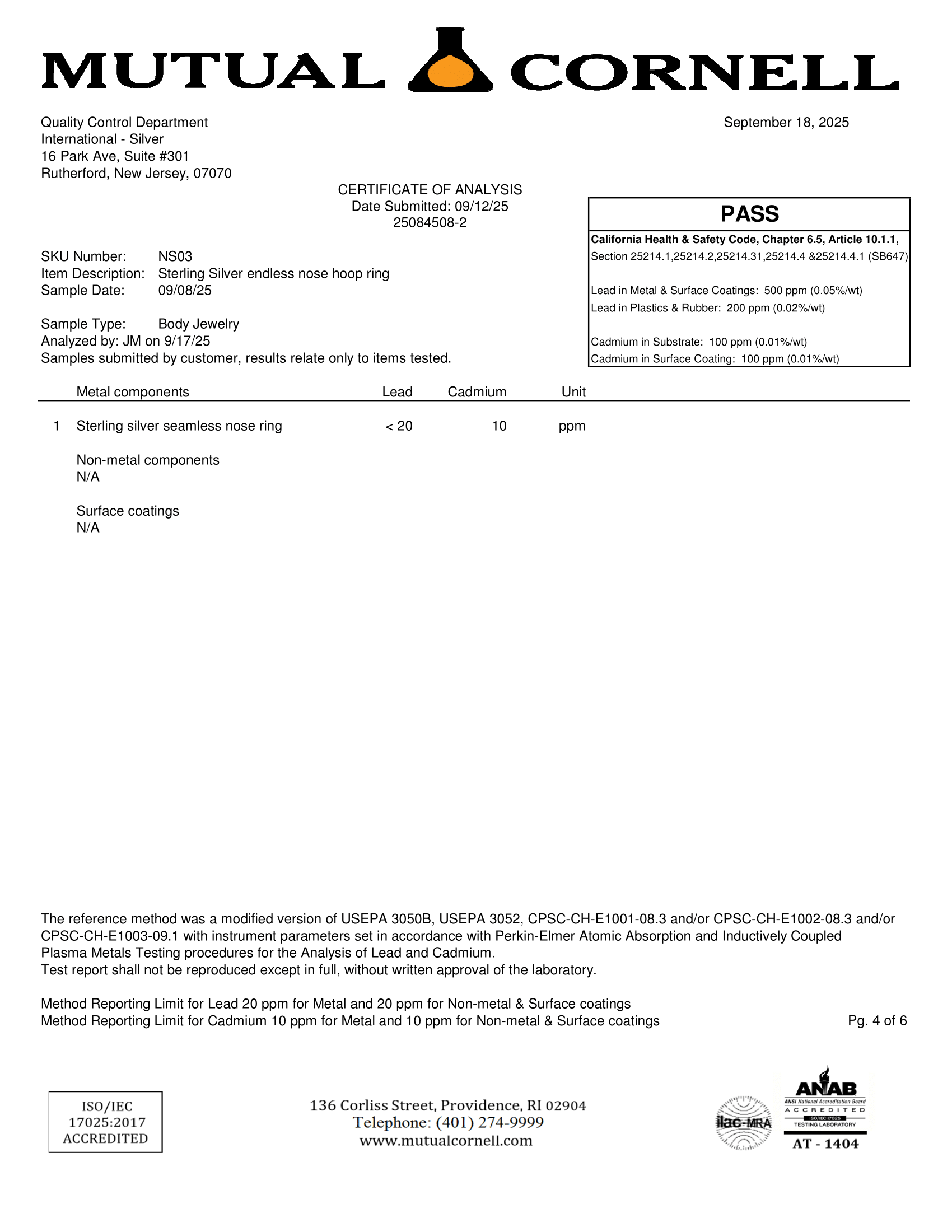 Certification of Titanium G23 of International-Silver Body Jewelry
